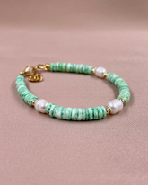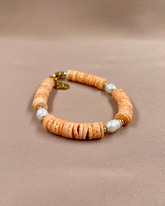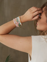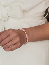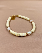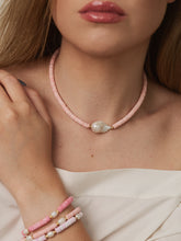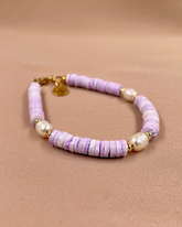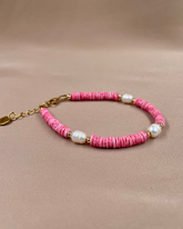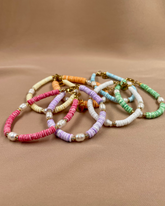 Bracelets inspired by childhood candies, made of natural dyed shell beads and freshwater pearls, with a playful and delicate pastel color scheme.