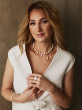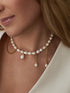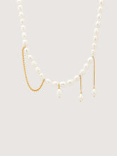 The classic pearls in not-so-classic pearl necklace design. The Amelia necklace embodies light elegance and playful creativity. This piece features large, nearly one-centimeter wide oval-shaped white freshwater pearls and delicate raindrop-like pear-shaped beads. The entire design is stylishly completed with a stainless steel chain.