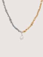 Combination of an elegant choker and princess necklace - Nora. Hand-selected hematite stone beads were carefully combined, with a beautiful freshwater pearl completing the design. Zinc-plated hematite creates an impression of exclusive luxury. After wearing Nora for many years, I have found that this combination of hematite and pearls looks excellent for casual and formal wear. The Nora necklace design shines in three different variations: gold, silver, and a combination of these two metals, where one side of the necklace shines in gold and the other in silver.