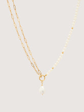 This necklace consists of two main parts: an 18K gold-plated chain on one side of the necklace and white freshwater pearls on the other side of the necklace, and the adjustable length chain gives you the freedom to choose the length that suits you best.