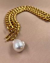 The Helena stainless steel necklace is very popular among lovers of chunky jewelry. Helena is special in that it can be worn with a baroque pearl attached, or with a beautiful baroque pearl on the chain. This necklace can be worn alone or paired with other necklaces.
