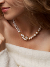 Gloria necklace is a combination of three different types of pearls. The centre of the necklace features three large pearls framed by gold plating and zirconia eyelets.